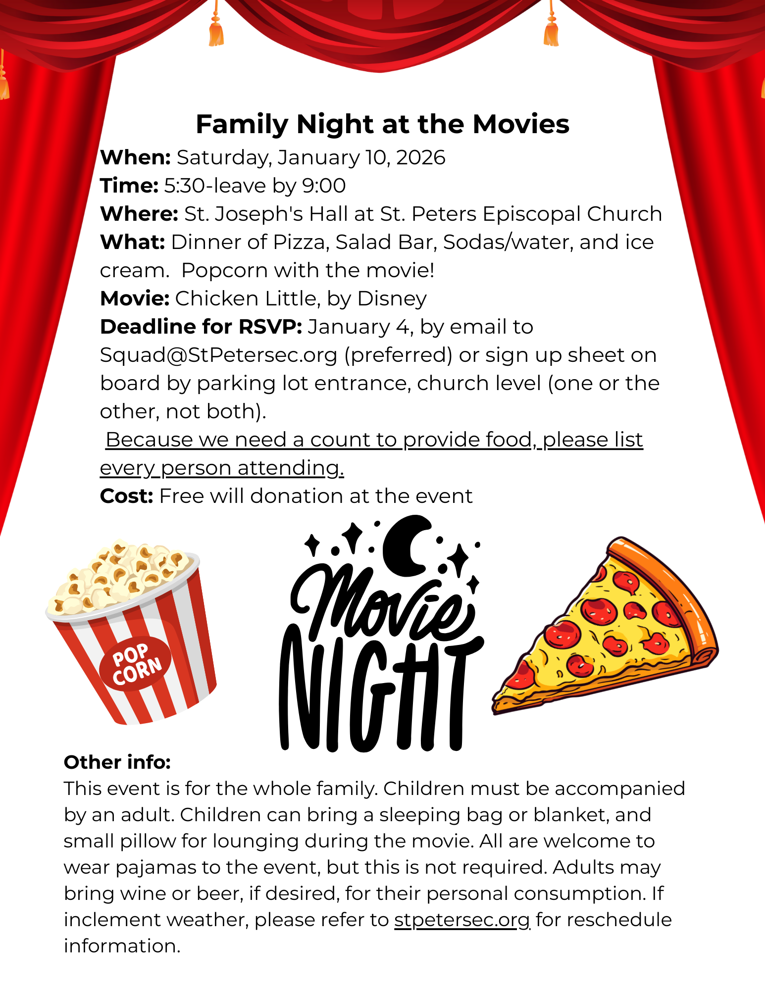 This event is for the whole family. Children must be accompanied by an adult. Children can bring a sleeping bag or blanket, and small pillow for lounging during the movie. All are welcome to wear pajamas to the event, but this is not required. Adults may bring wine or beer, if desired, for their personal consumption. If inclement weather, please refer to stpetersec.org for reschedule information.